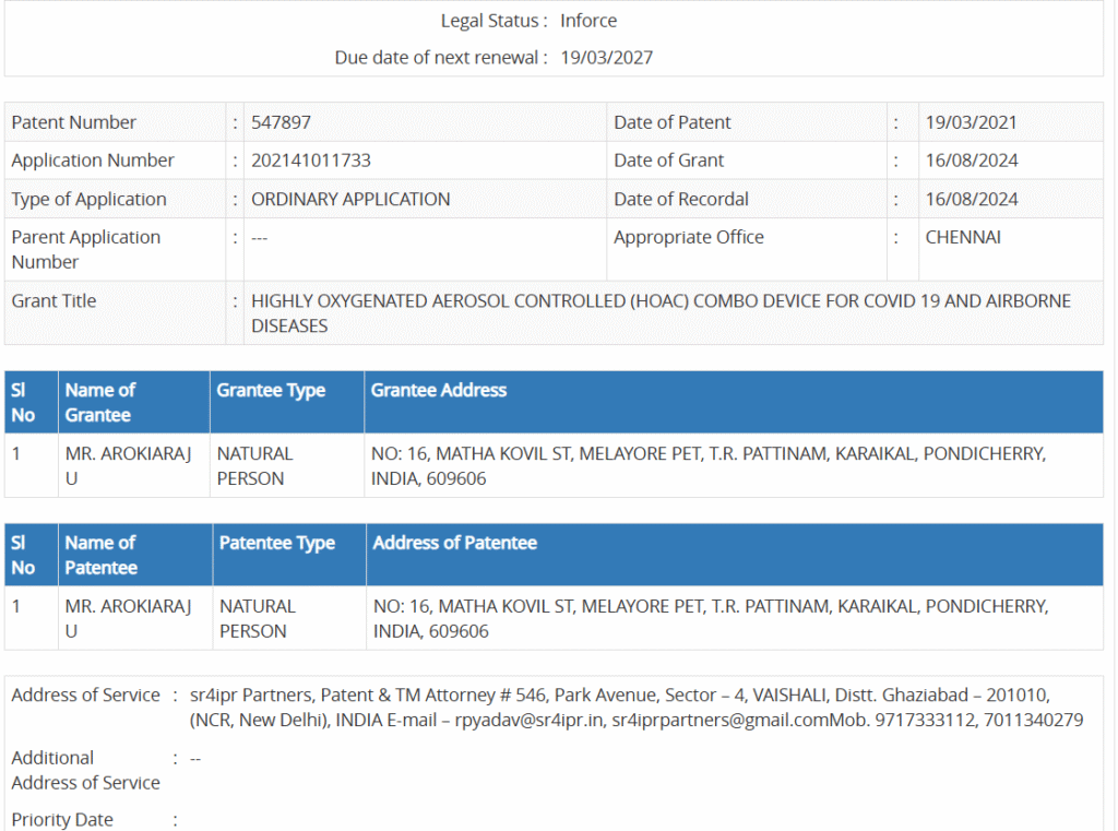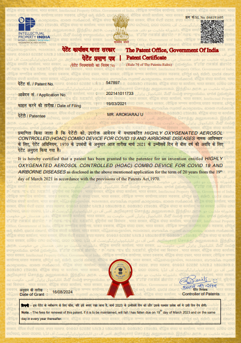“Highly Oxygenated Aerosol Controlled (HOAC) Combo Device for COVID-19 and Airborne Diseases” – was granted a patent with the expert support of Sr4ipr Partners.